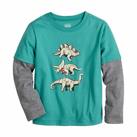 He’ll feel like the coolest kid on the playground in this boys’ faux layered jersey sleeve dino skater tee from Jumping Beans.